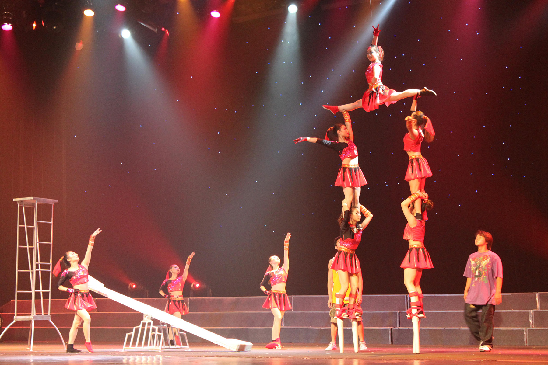 7演目(エンジェル アクロバット / 椅子頂 / 火流星 / 空竹 / 空中シルク / 雑技バレエ / 壷特技)